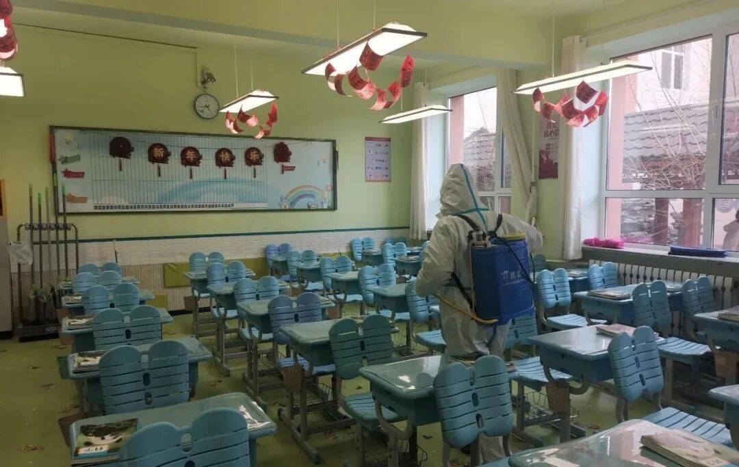 建牢校园卫生健康防地,保障师生身体健康和教育讲授次序平稳有序,开学前学校对班级办公室及公共区域进行消毒工做。